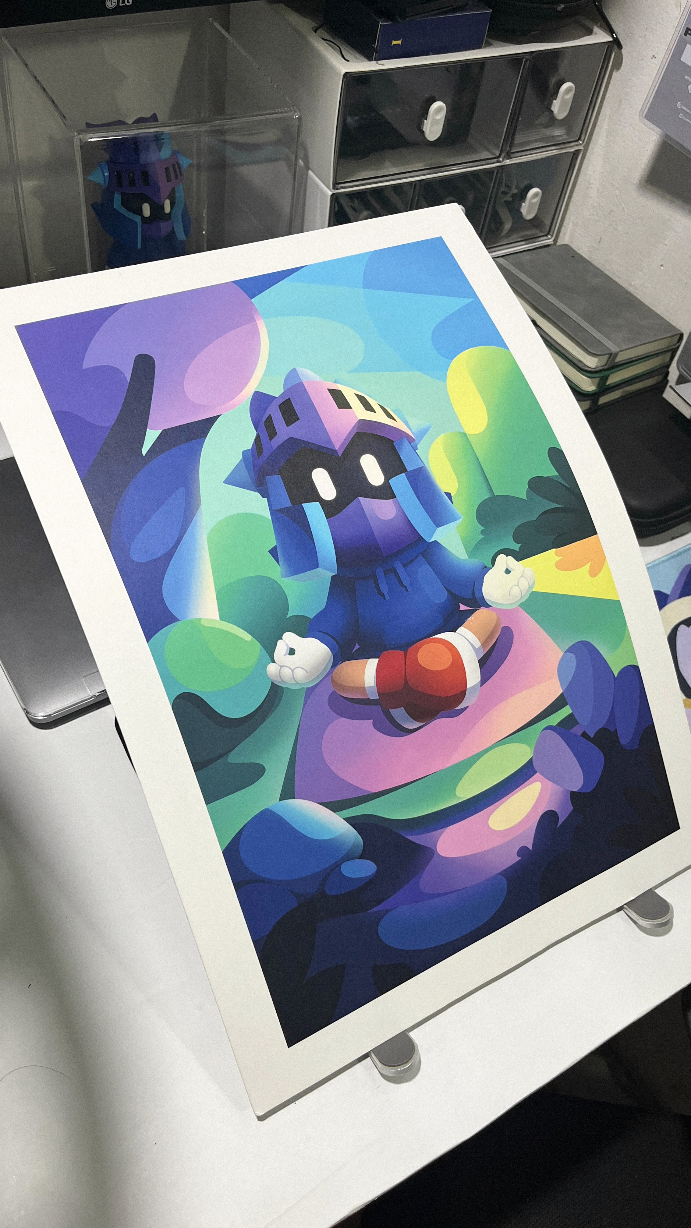 Physical products created from original artworks, including prints, keychains, mousepads, and collectible toys. Each item brings the artwork into a tangible form beyond the digital space.